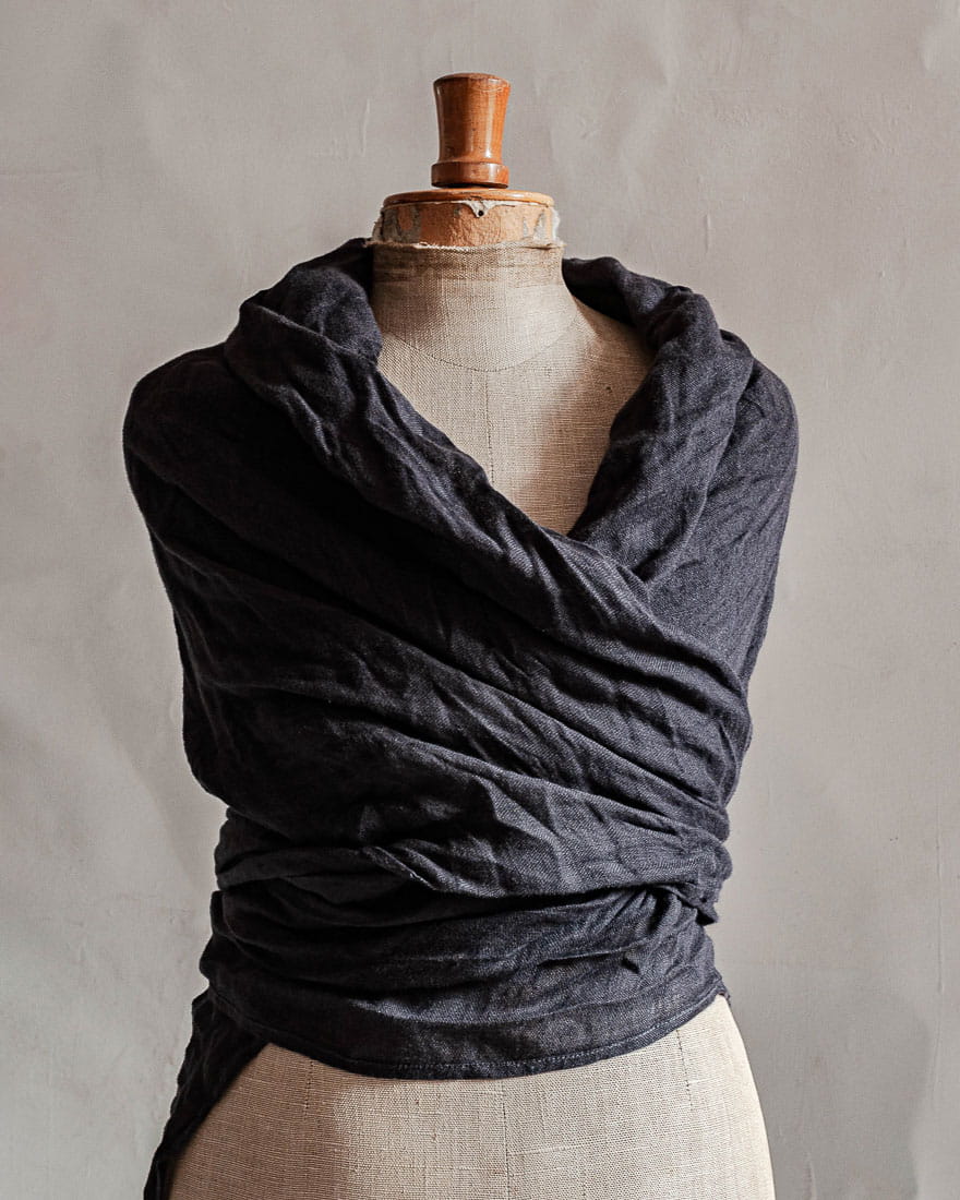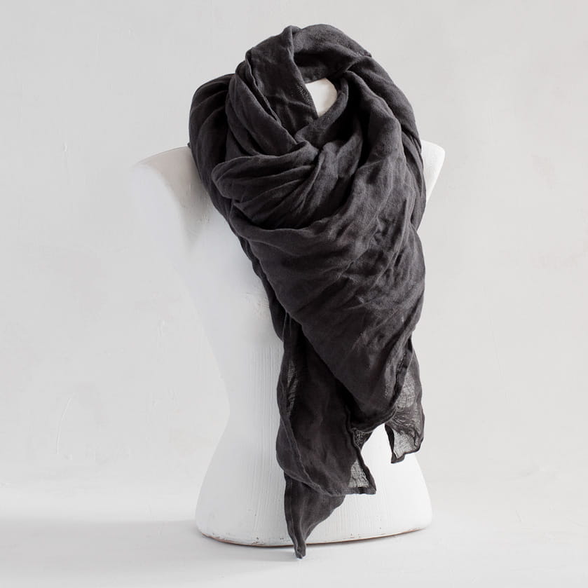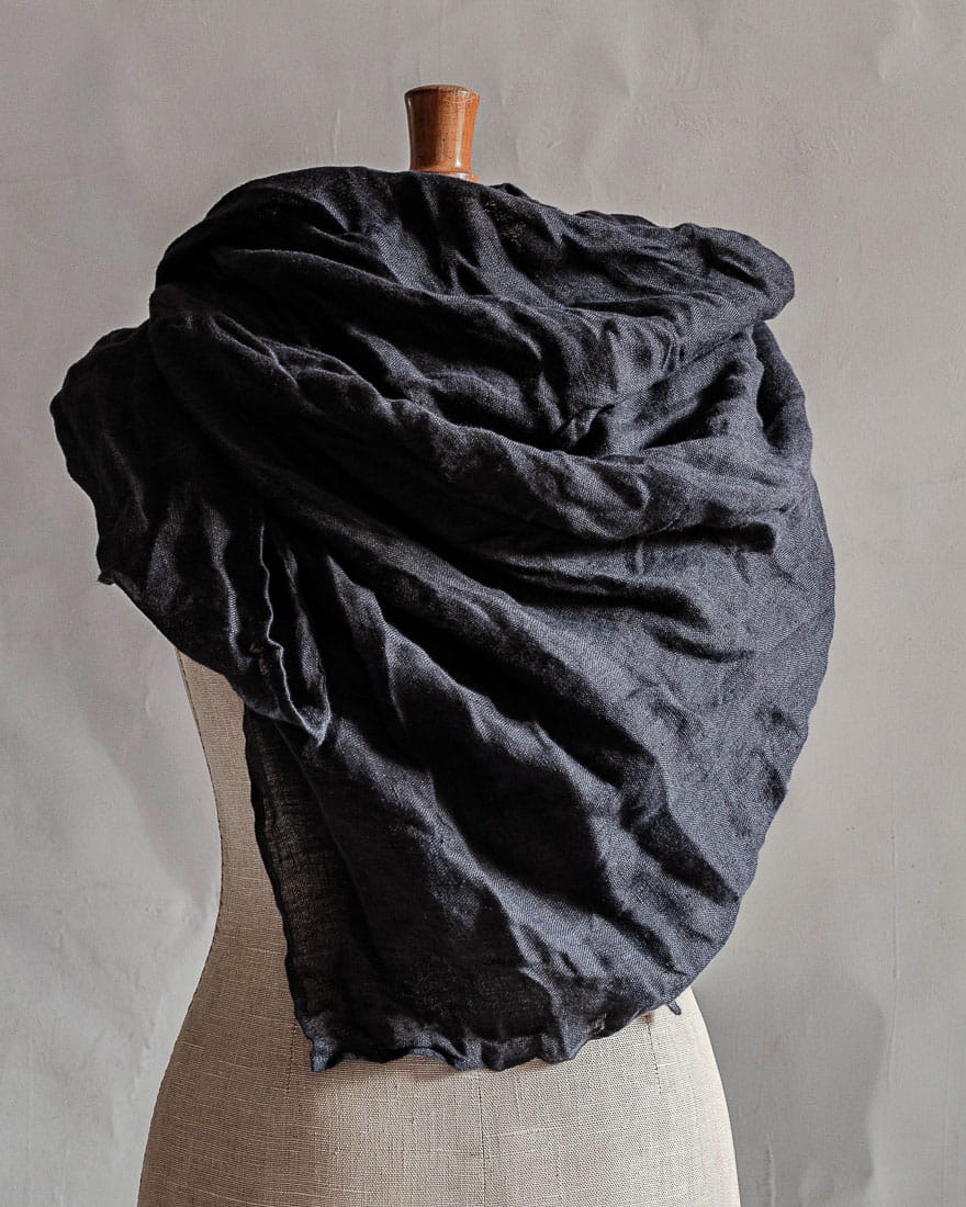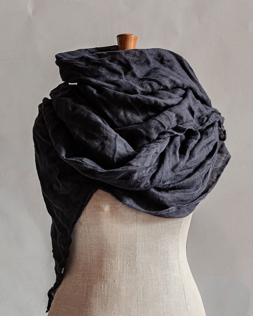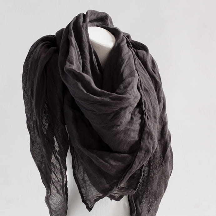 Chusta wykonana jest z cieniutkiego, zmiękczanego, kreszowanego lnu w kolorze antracytowym.