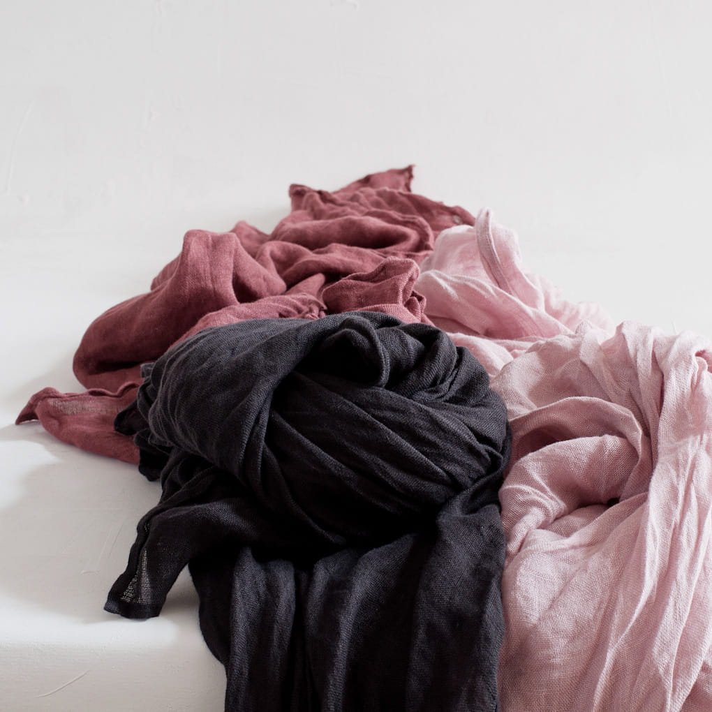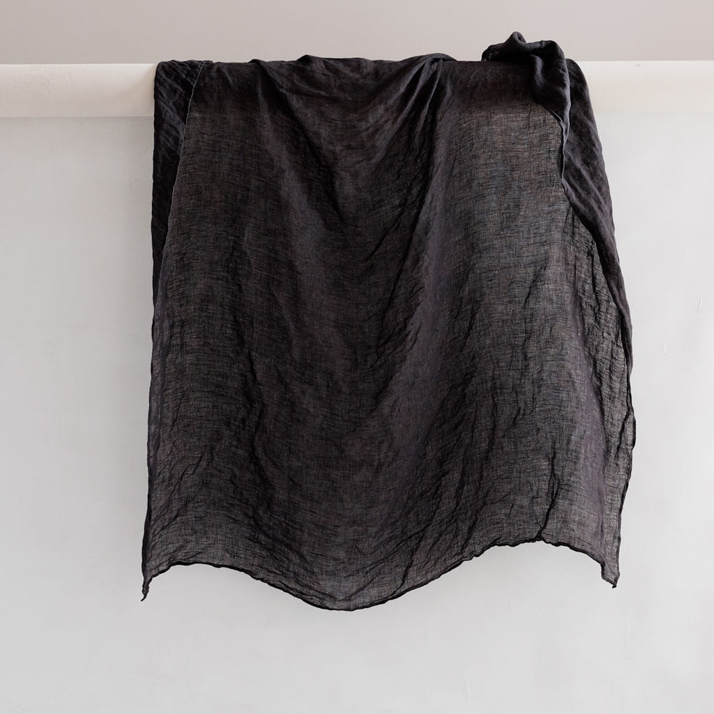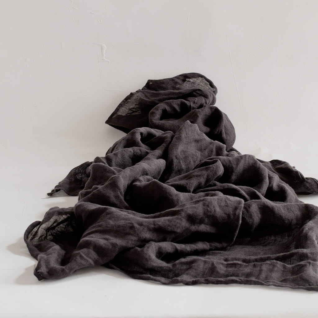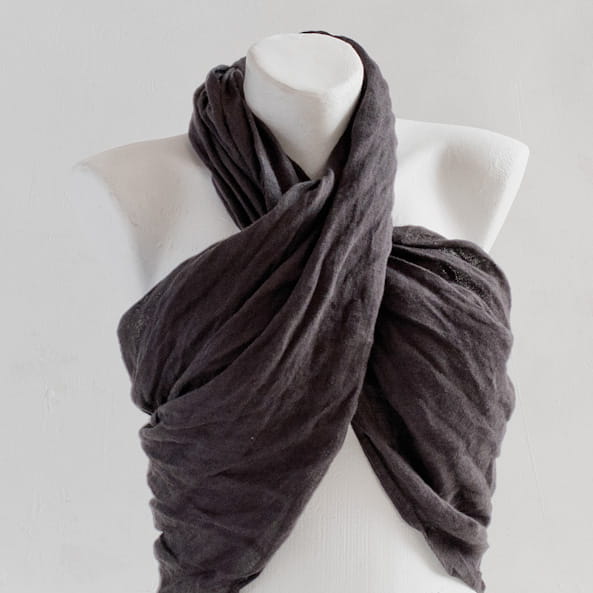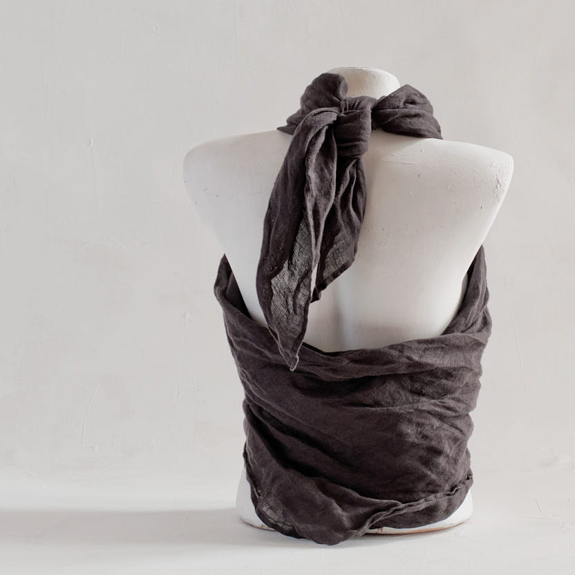 Chusta wykonana jest z cieniutkiego, zmiękczanego, kreszowanego lnu w kolorze antracytowym.