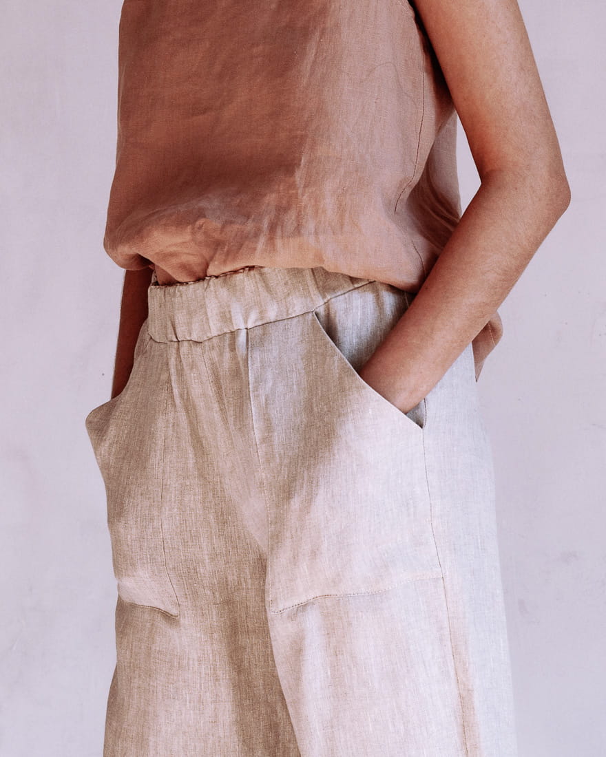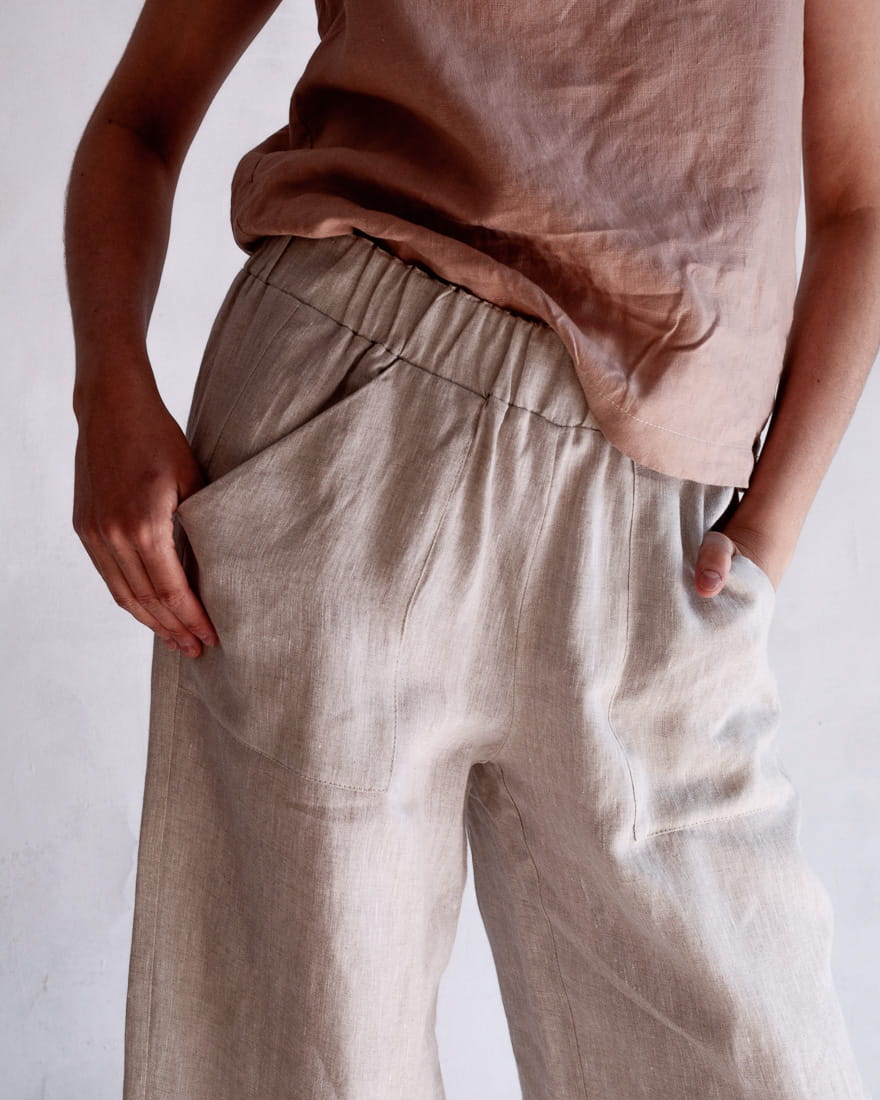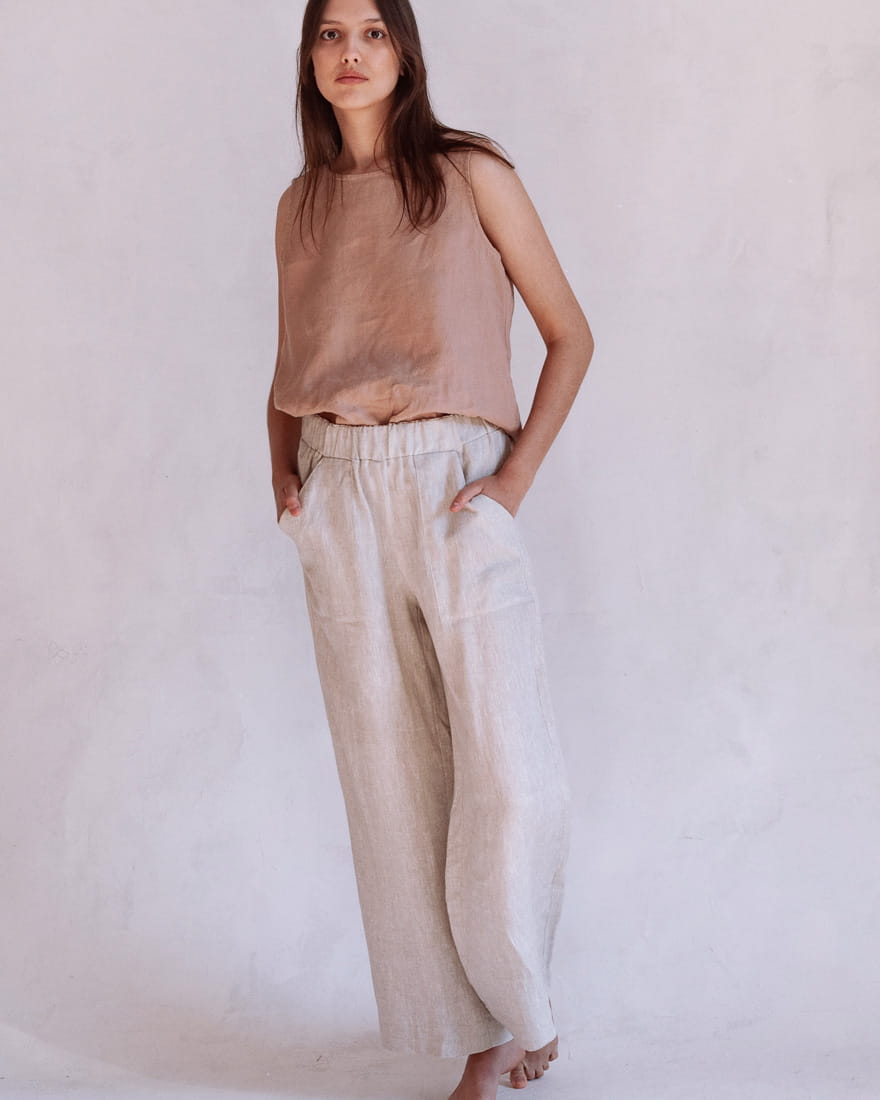 Szerokie wygodnie lniane spodnie w kolorze naturalnym jasnym.